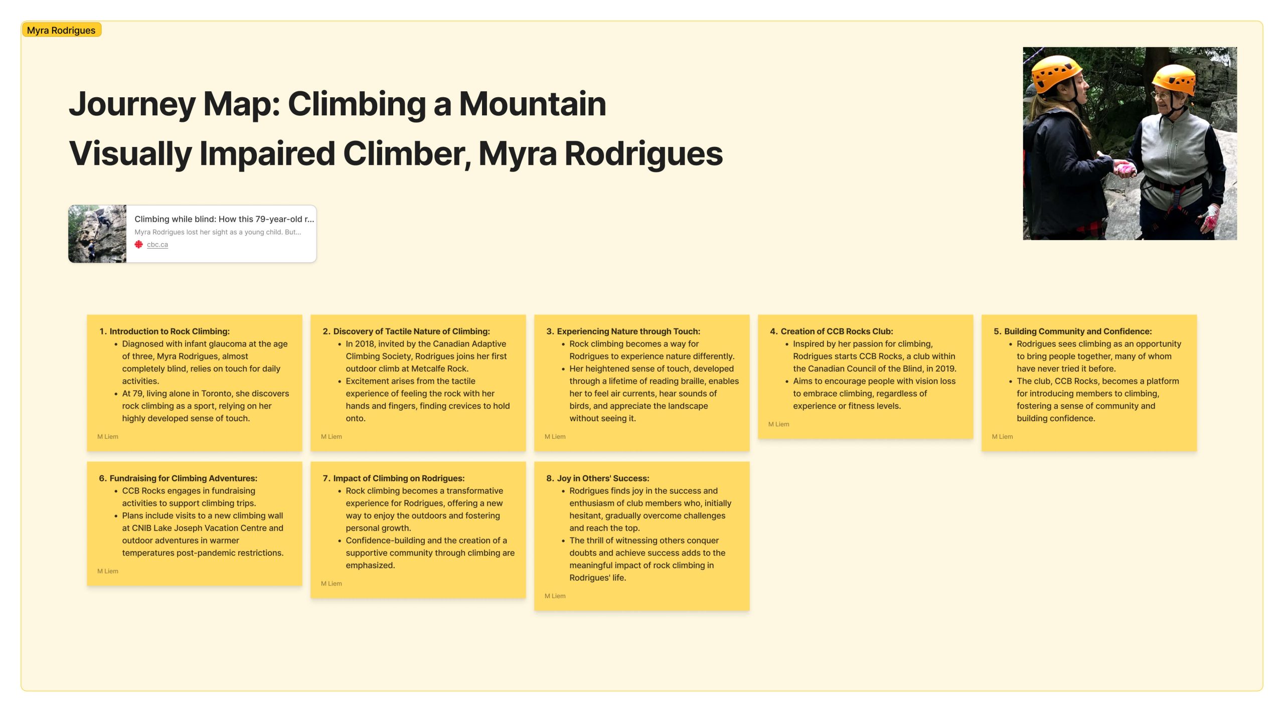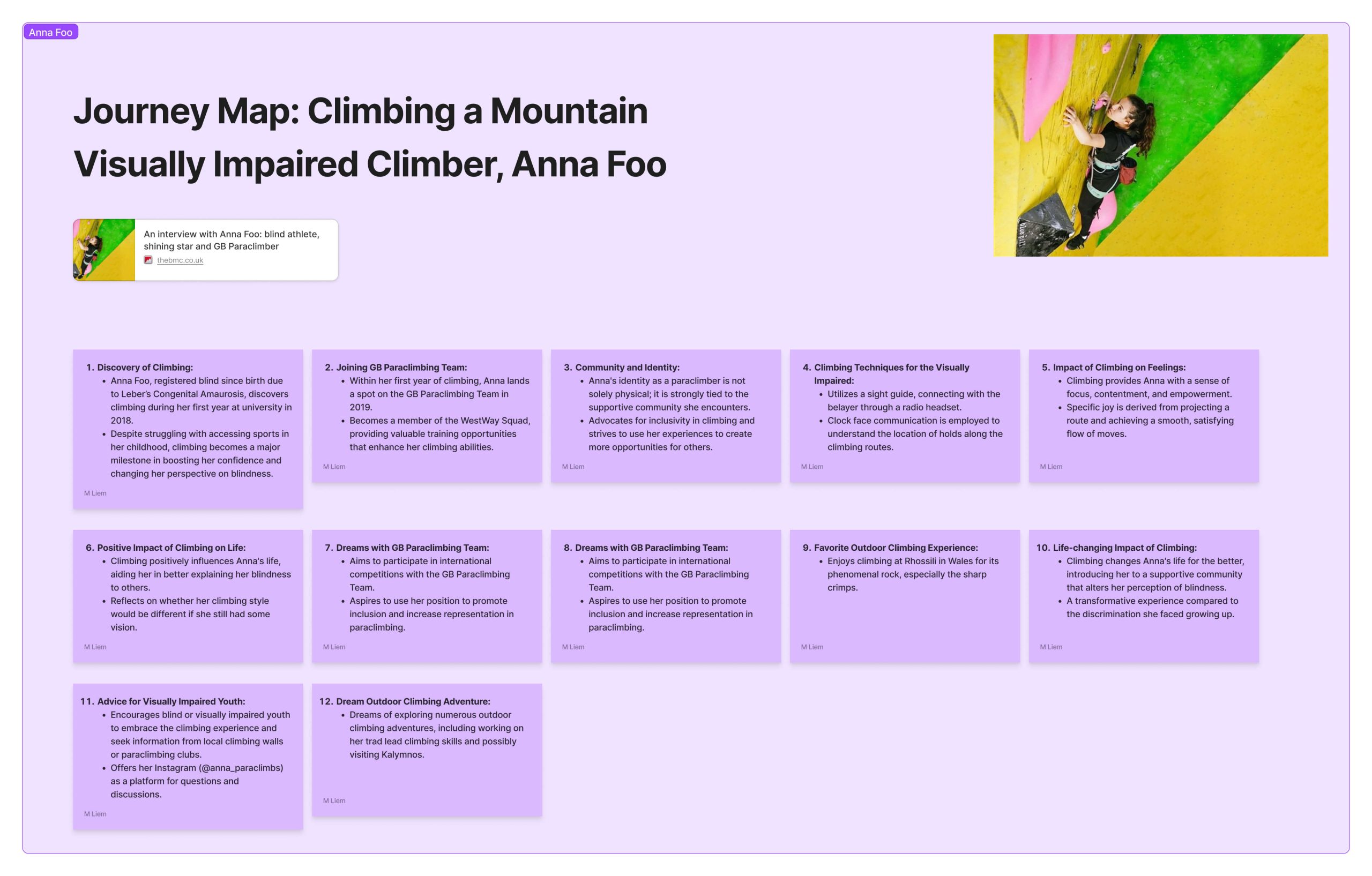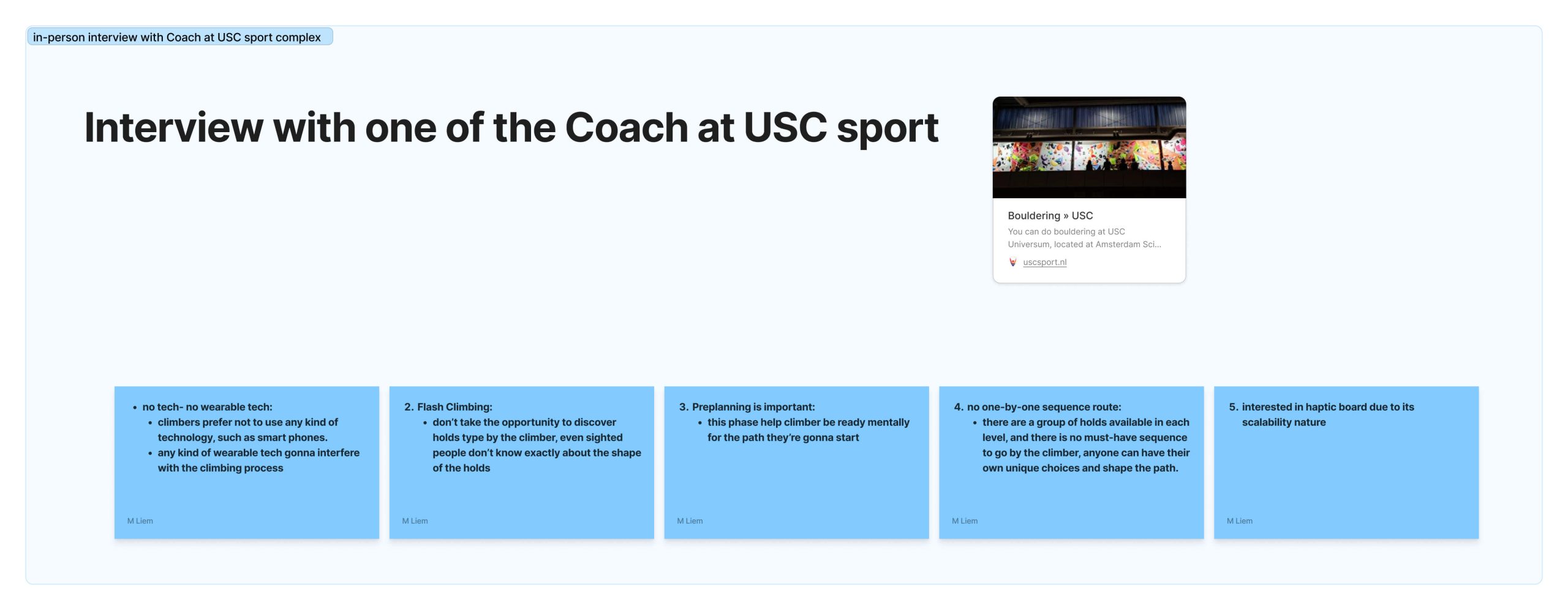 - Held interviews with a climbing coach to gather expert opinions and learn about the specific needs of visually impaired climbers.
