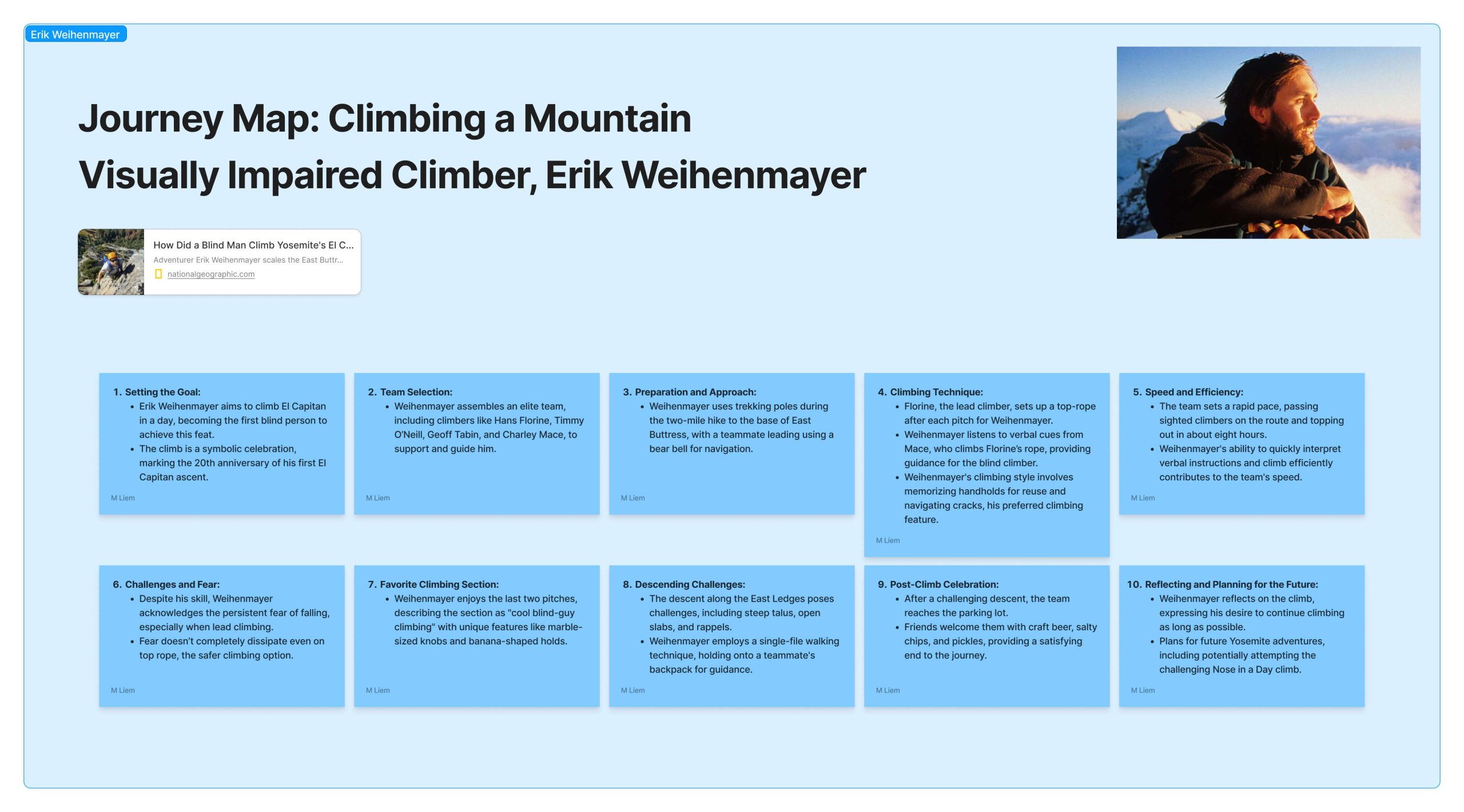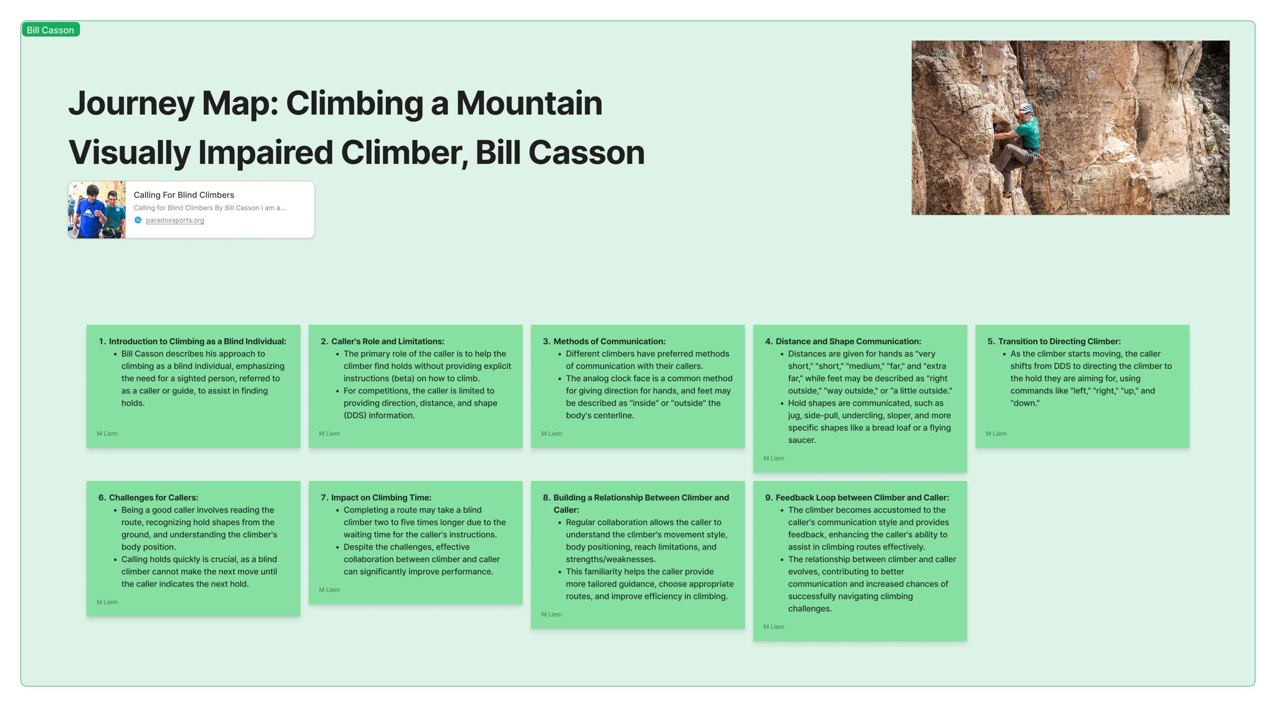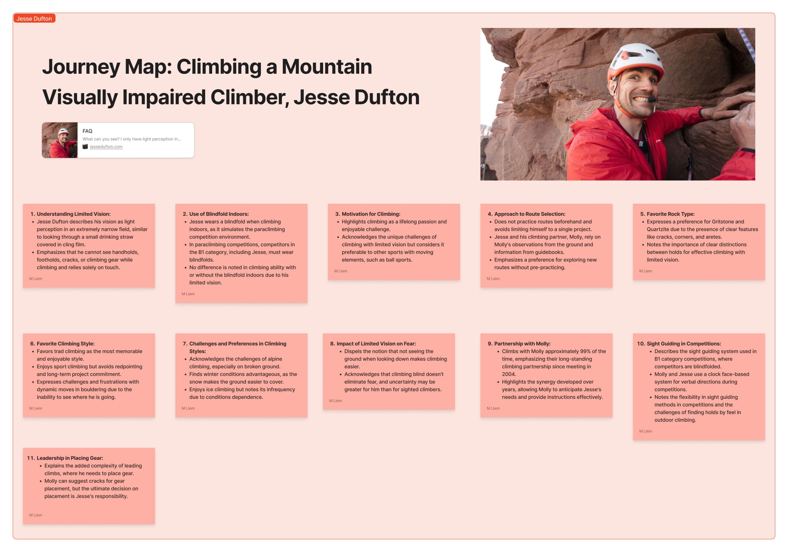 - Watched numerous YouTube videos featuring visually impaired climbers to understand their techniques, struggles, and workarounds.